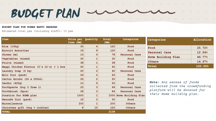 Excess funds and unproductive usage: On the other hand, if the funds raised exceed the targeted amount, there is a risk of unproductive usage of the accumulated funds. It is important to carefully manage and allocate these excess funds to avoid wasteful spending. Hence, the committee members have agreed to transfer the excess funds collected to Rumah Bakti Harapan to support their funding to build a house on their own land which is located at Kg. Lomawang Tuaran.
