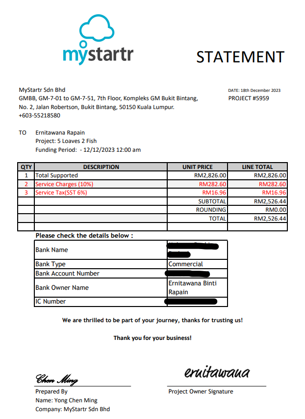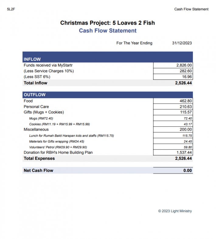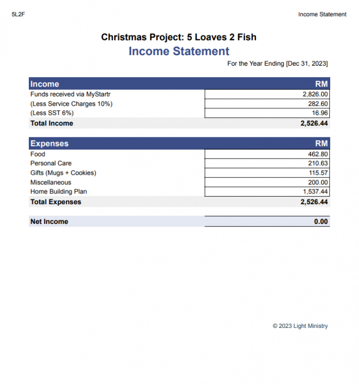 We are pleased to announce that through the mystartr crowdfunding platform, we have successfully collected a total of RM2,826.00 for the Christmas Project: 5 Loaves 2 Fish. This achievement would not have been feasible without the generous support from all of you. We would like to take this opportunity to express our sincere appreciation to all the supporters of the project. Your contributions have made a significant impact and will go a long way in helping us achieve our goals.