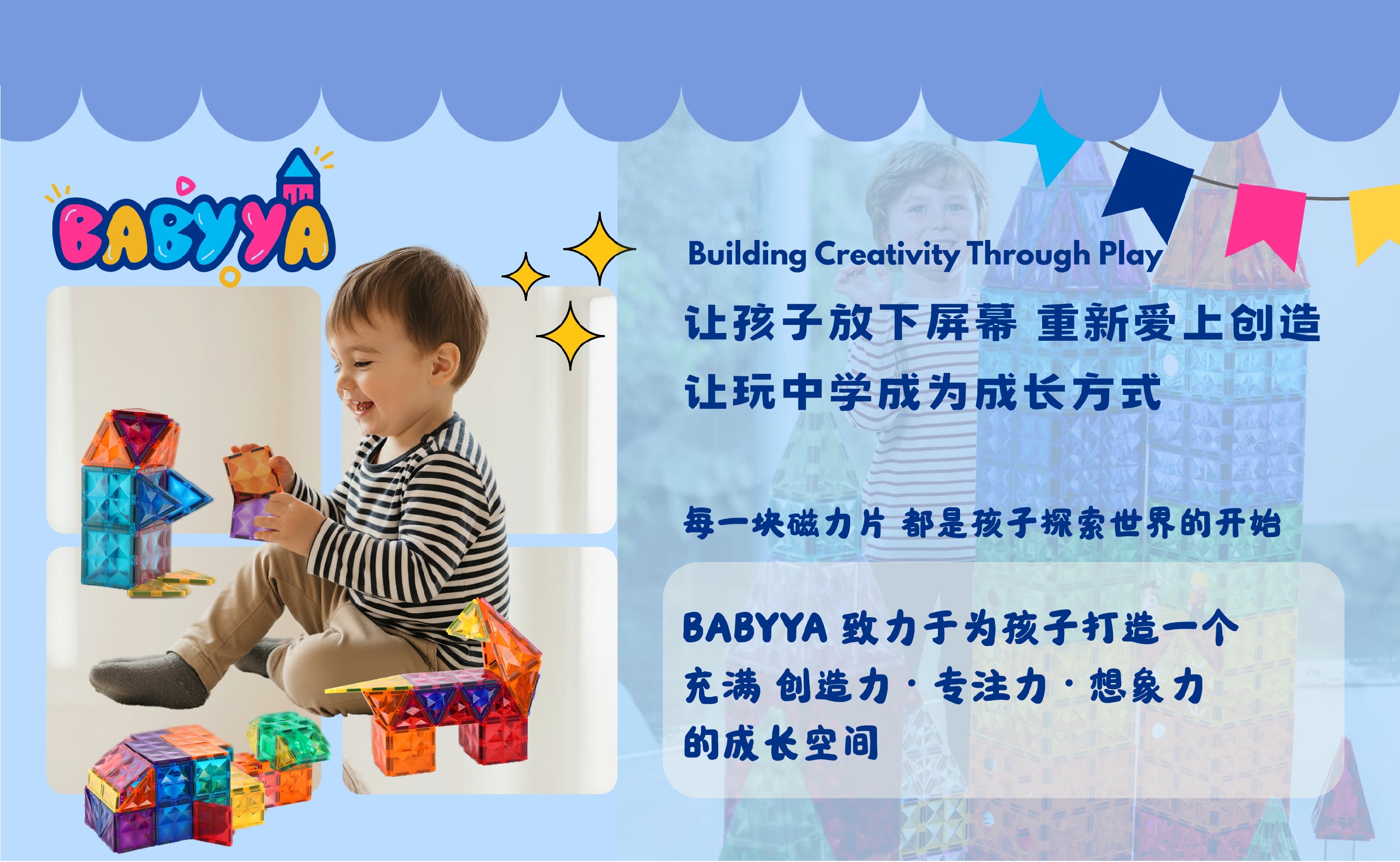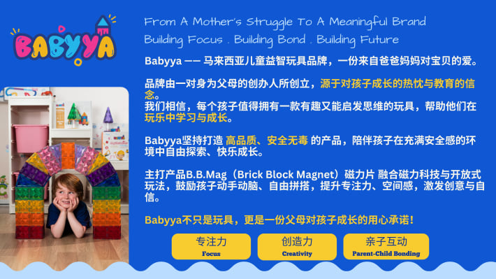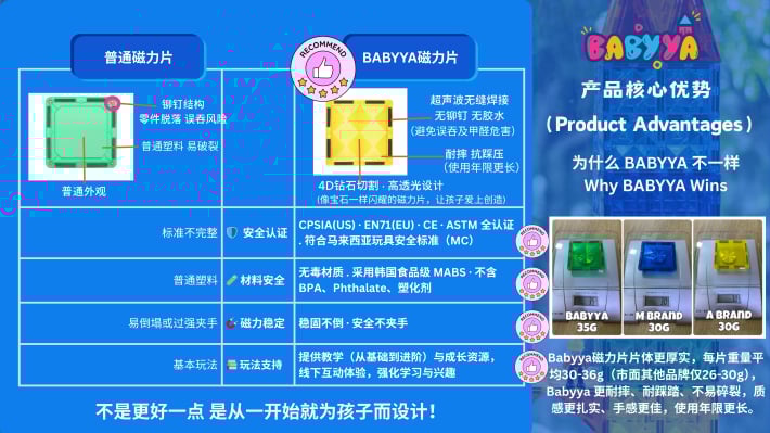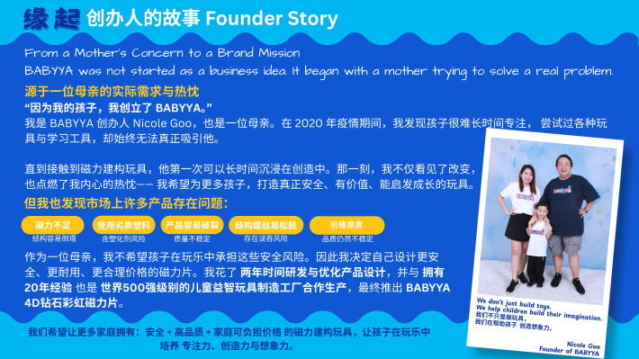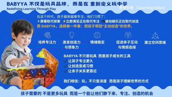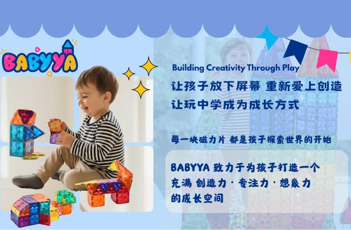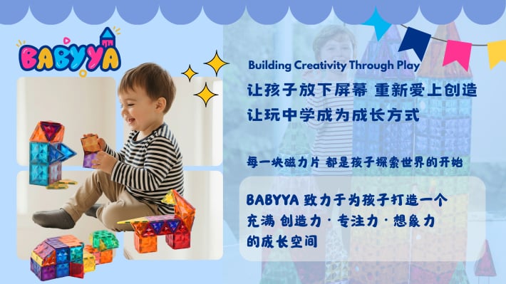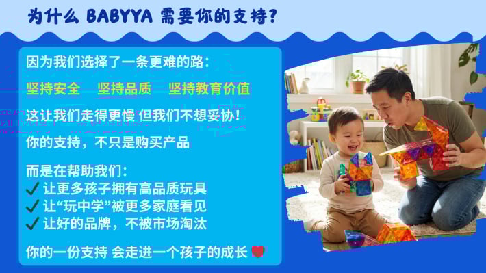 我是 Nicole,一位妈妈,也是 BABYYA 的创办人。 当我看到孩子因为磁力片而专注地创造自己的世界,我意识到“玩”可以成为一种真正的学习方式。 于是我花了两年时间,打造出一款更安全、更耐用的磁力片,只为给孩子一个更好的成长开始。