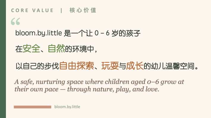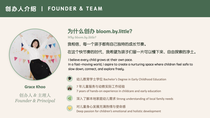 我是 Grace,一名幼教老师,也是 Bloom by Little 的创办人。做这一行越久,我越发现,很多孩子其实不缺学习,而是缺少被好好理解与回应的时刻。我开始思考,如果有一个地方,能让孩子既感到安全,又能自在地接触自然,会不会更接近他们本来的样子?于是,我决定把这个想法,慢慢实现出来。