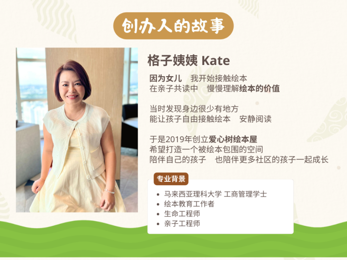 “因为女儿,我开始接触绘本。” 我是两个孩子的妈妈。2015年怀着大女儿的时候,我第一次接触绘本,从那时起就对绘本爱不释手。 在和女儿共读的过程中,我慢慢理解了绘本的价值,也看见它带给我们的幸福感。 当时我发现,身边很少有地方可以让孩子自由接触绘本、安静阅读。于是在2019年创立了爱心树绘本屋,希望打造一个被绘本包围的空间,陪伴自己的孩子,也陪伴更多社区的孩子一起长大。... See More