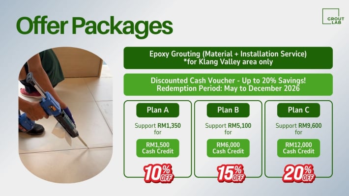 Epoxy Grouting cash voucher worth RM6,000 (15% discount). Usage for site located in Klang Valley area only from May to Dec 2026.