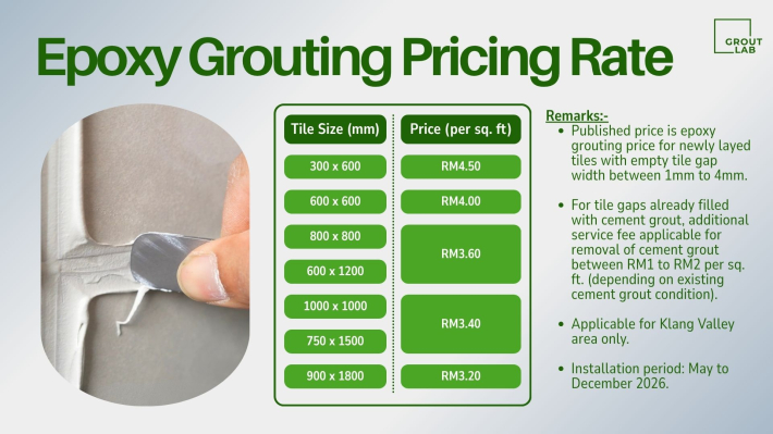 Epoxy Grouting cash voucher worth RM1,500 (10% discount). Usage for site located in Klang Valley area only from May to Dec 2026.