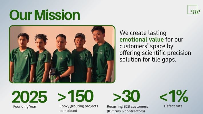 我是Rick美缝哥。我从小在传统五金店长大。 Nippon、Sika、Mapei…… 这些国际品牌,一直占据着我们的货架。 我心里一直有个疑问: 有没有一天,马来西亚的建筑材料品牌,也能走向世界、甚至主导市场? 一年前,我创立了 Grout Lab — 提供专业瓷砖美缝施工服务 只因为一个很简单的信念: 瓷砖缝隙,不应该难看。它应该提升整个空间的质感。 这一年,市场给了我们答案。 我们的业绩翻倍, 团队翻倍, 一季接一季地成长。 但,这只是开始。 接下来呢? 我们要打造的,不只是一个服务品牌。 而是一个属于马来西亚的建筑化学品牌 —— 以研发为核心,以美学为导向,坚持高品质。 而要走到这一步,我们需要: 更多资源, 更多人才, 以及…… 更多曝光。 因此,我决定参加圆梦工厂创业比赛。