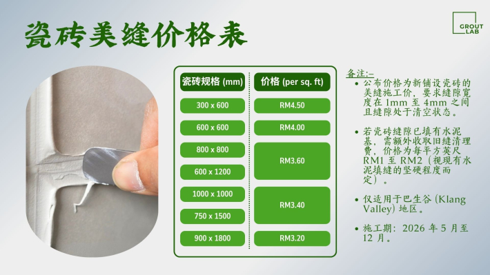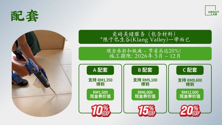瓷砖美缝现金券价值RM12,000 (20%折扣)。施工地点限于巴生谷一带。施工期限2026年5月至12月。