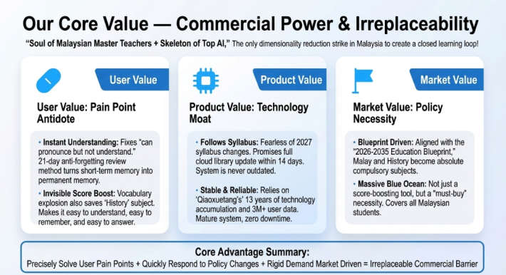 核心定位:成为我们的核心伙伴,把最有效的AI马来文学习效果工系统,分享给更多需要马来文及格和焦虑马来文的孩子!