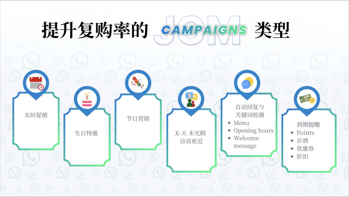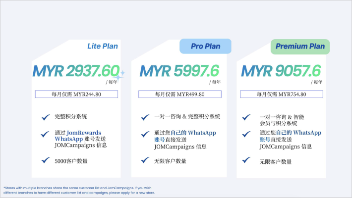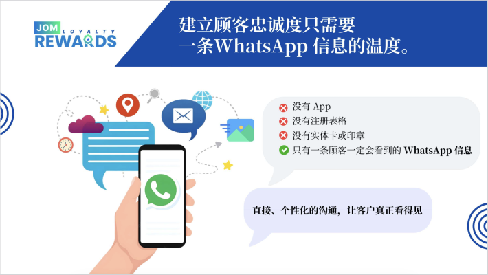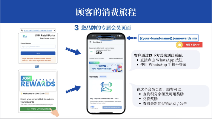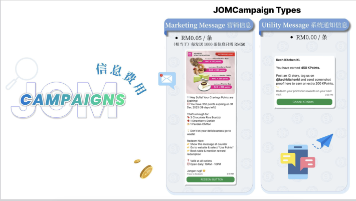 该配套提供 智能会员与积分管理系统,并包含一对一咨询服务,帮助企业制定更精准的客户营销策略。企业可以通过 自己的 WhatsApp 商业账号 直接发送 JOMCampaigns 信息,实现高效且个性化的客户互动。