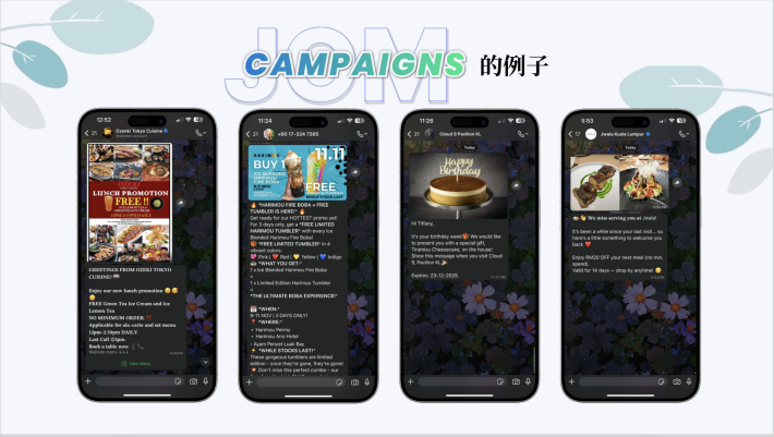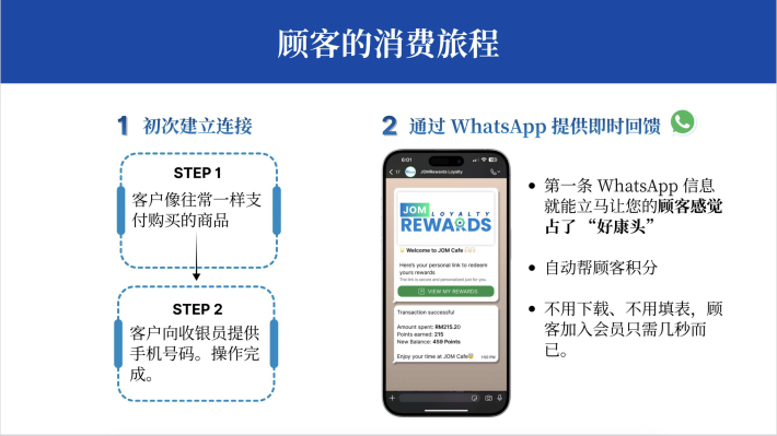 与传统会员系统需要下载 App 或填写复杂注册表不同,JOMRewards 通过 WhatsApp 即可完成会员建立和客户沟通,使顾客能够轻松加入会员并接收商家的促销活动、优惠券及积分提醒。系统还可以自动发送生日优惠、节日促销和营销活动信息,让商家在无需额外人力的情况下持续与顾客保持互动。