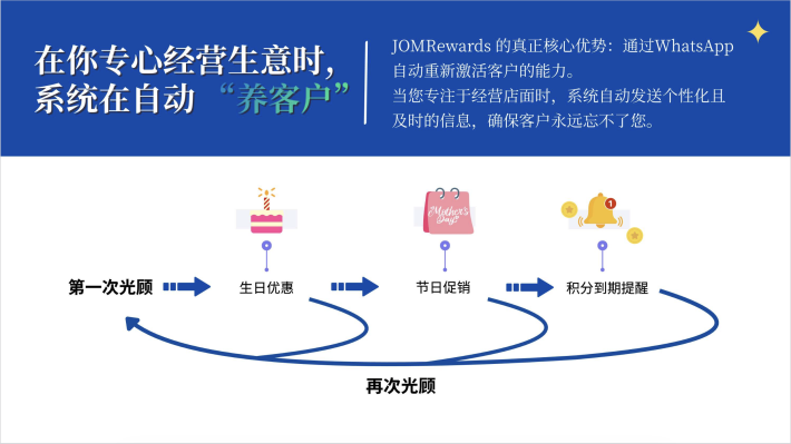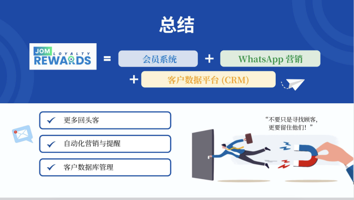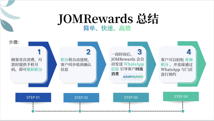 JOMRewards 是一个基于 WhatsApp 的客户忠诚度与营销自动化平台,专为餐饮业及中小企业设计。该系统帮助商家在顾客消费过程中自动收集客户数据,并建立会员积分与奖励机制,从而有效提升客户留存率和复购率。
