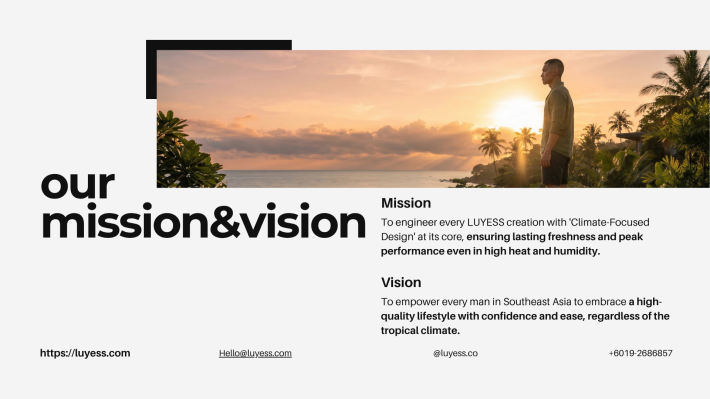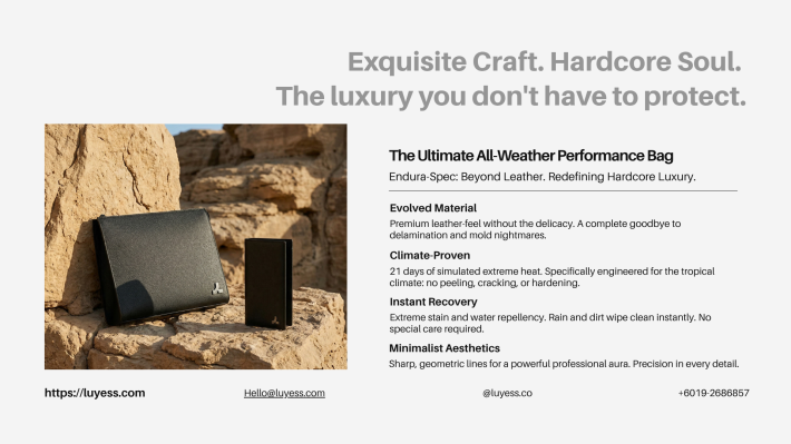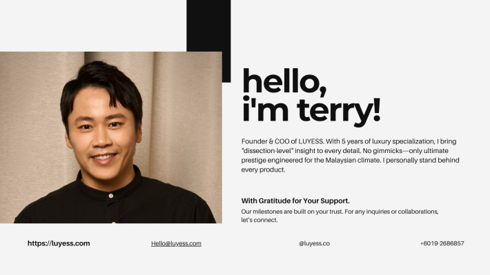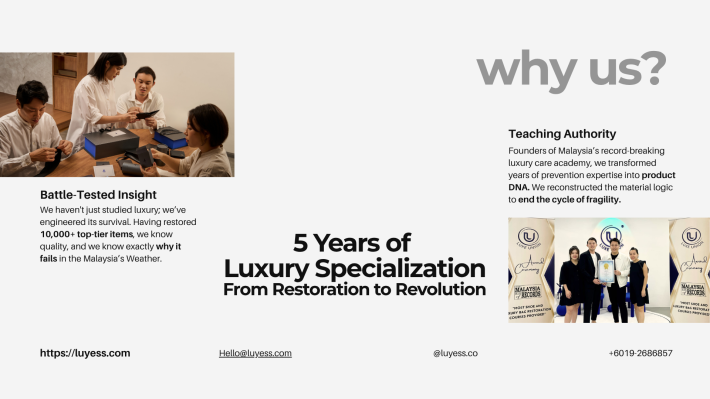 5 年实战:看透高端材质的“优点和缺点” 创办人拥有超过 5 年的奢侈品护理与面料研究经验 。在深耕衣物清洗、包包洗护、皮革修复及换皮服务的过程中 ,他每天都在直面因大马湿热气候、错误使用习惯而导致的材质体验感痛点 。他发现,即便再昂贵的产品,如果不适配本地气候,也难逃牺牲舒适度与使用寿命的命运 。 学院派背景:从“教人修”到“自己造” 为了系统化分享这份经验,他曾创办并领导奢侈品护理学院,为行业培训了专业人才 。在长期接触顶级材质与拆解产品结构的过程中,他对面料耐用性、舒适度以及科技材质的应用建立了“拆解级”的深度理解 。 创立 LUYESS:专为马来西亚天气打造的男士品牌 在成功运营奢侈品护理5 年并顺利移交卖给投资者后,他决定将这套深厚的面料逻辑,从“修护端”延伸至“研发端” 。他不再满足于仅仅修复他人的产品,而是要亲自打造出 LUYESS —— 一个真正为现实生活、专为马来西亚天气而生的男士品牌,让舒适与品质不再受气候限制 。