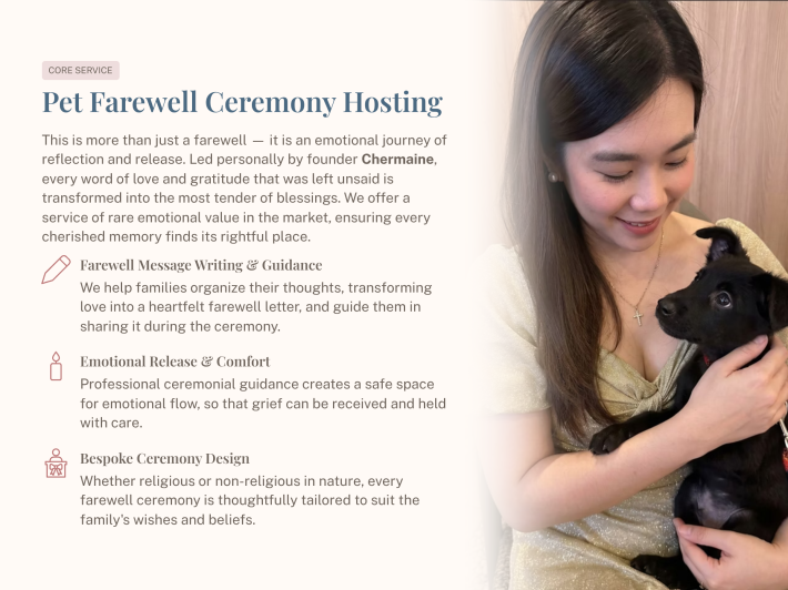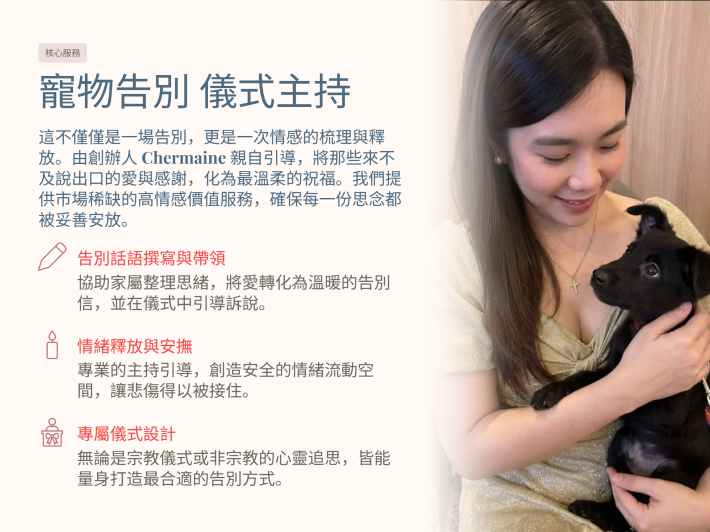 我是一名持有中国孔子学院认证《国际汉语教师资格证》,以及马来亚大学育儿教育文凭的教育工作者。 长期从事教学与沟通,让我不仅擅长“教”,更擅长“理解”。 我习惯去倾听、去感受,也更懂得在人最脆弱的时候,如何温柔地承接情绪。 同时,我也是一名专业活动主持人。 我熟悉每一个流程的节奏,也懂得如何在重要时刻,让一切有序、得体,并且有温度。 而现在,我选择把这两种能力,带入一个更有意义的领域——宠物水化(Aquamation)。 因为我发现,很多人不知道该如何好好说再见。 离别,常常来得太突然,而情感,却无处安放。 所以我希望,用更温和、更环保、更有尊严的方式, 为每一位宠物主人,守护这段最后的陪伴。 让告别,不只是结束, 而是一段被温柔安放、值得被记住的爱。 I am an educator certified by the Confucius Institute with the International Chinese Language Teacher Certificate, and I also hold a Diploma in Parental Education from the University of Malaya. Years of experience in teaching and communication have shaped me not only to “teach,” but more importantly, to truly understand. I listen, I feel, and I’ve learned how to gently hold space for others—especially in their most vulnerable moments. At the same time, I am a professional emcee. I understand the rhythm of every program and know how to bring structure, grace, and warmth to important occasions. Today, I choose to bring these two strengths into a more meaningful field—pet aquamation. Because I’ve come to realize that many people don’t know how to say goodbye. Loss often comes unexpectedly, and emotions are left without a place to rest. Through a gentler, more environmentally friendly, and dignified approach, I hope to support pet owners in honoring their final moments with their beloved companions. So that farewell is not just an ending, but a love that is gently held, and remembered.
