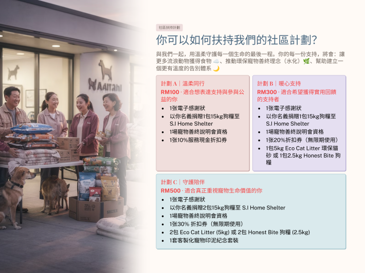 •捐赠1包15kg 狗粮至 S.I Home Shelter
