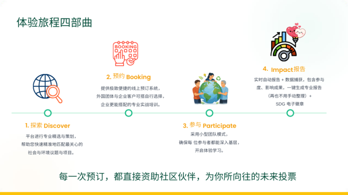 另一个挑战,是确保体验活动既具意义,也能顺畅执行。我们将与社区伙伴 共同设计试点体验项目,并根据参与者与社区的反馈持续优化模式。