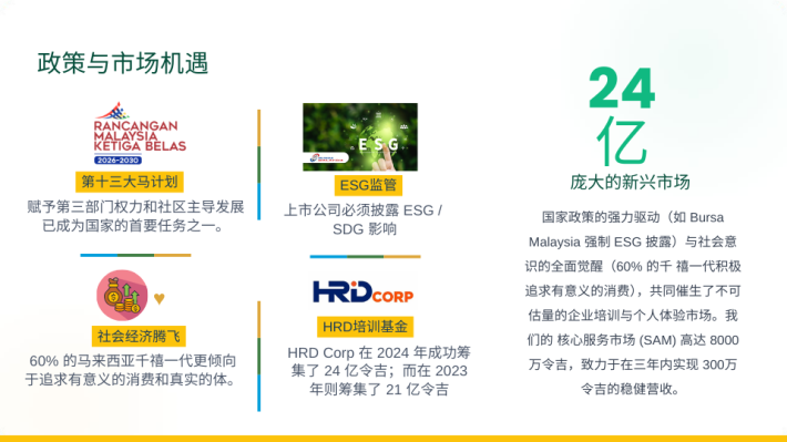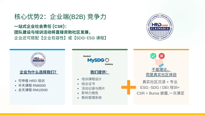 与此同时,MySDG Academy 也是 HRD Corp 注册培训机构,多年来为企业与组织提供可持续发展与社会影响相关的培训课程。