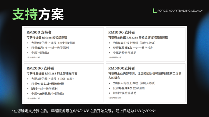 RM500 支持者 可获得价值168美金的初级课程 - 为期2天的线上课程(可安排时间) - 获得每月1次 一对一教学福利 - 专属社群辅助 *有效期限3个月