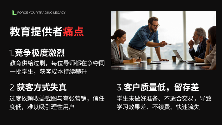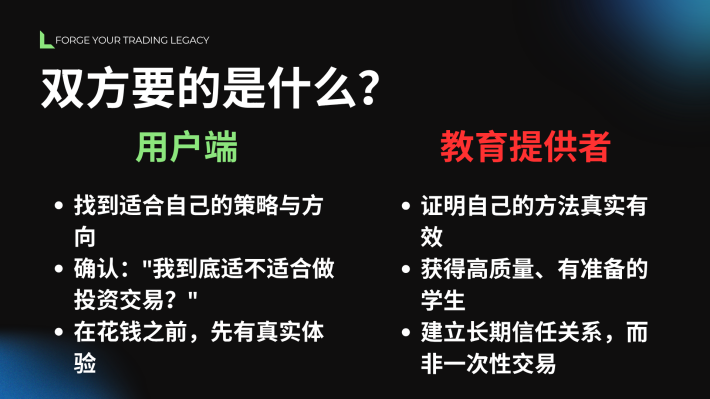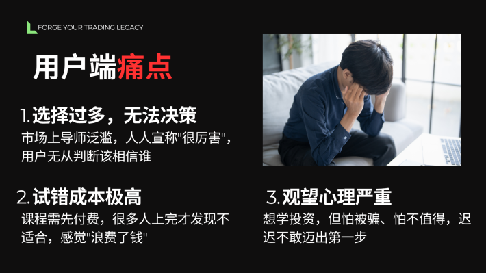 当前投资教育市场竞争激烈,大量导师与课程涌现,用户在选择上面临高度不确定性,同时也承担较高的试错成本。许多初学者在缺乏真实认知的情况下贸然入场,或在付费后才发现课程与自身不匹配,造成时间与金钱的浪费。另一方面,导师也面临获客成本高、客户质量参差不齐及留存率低等问题。