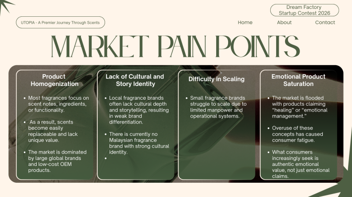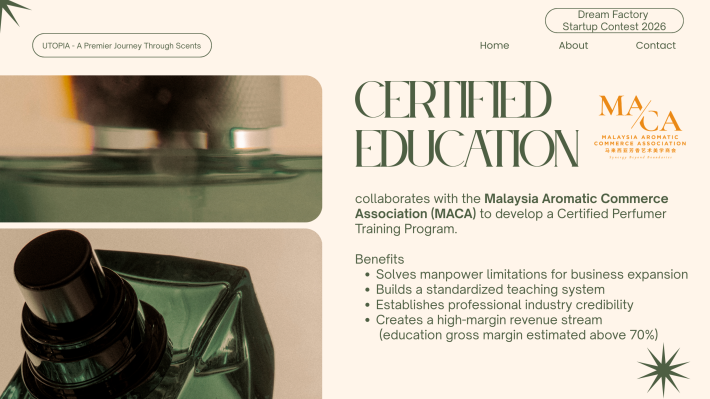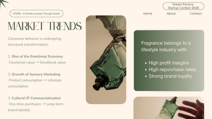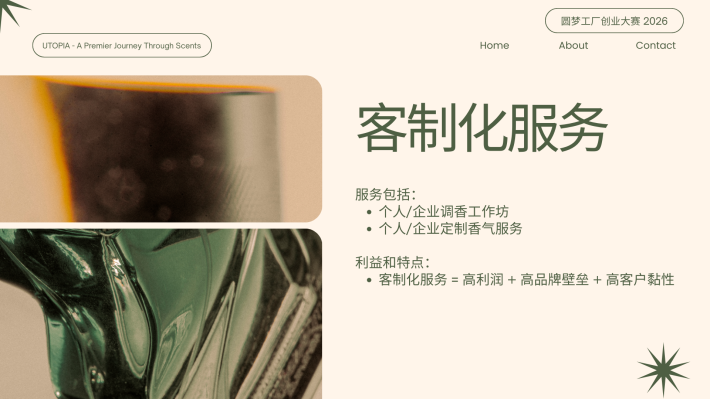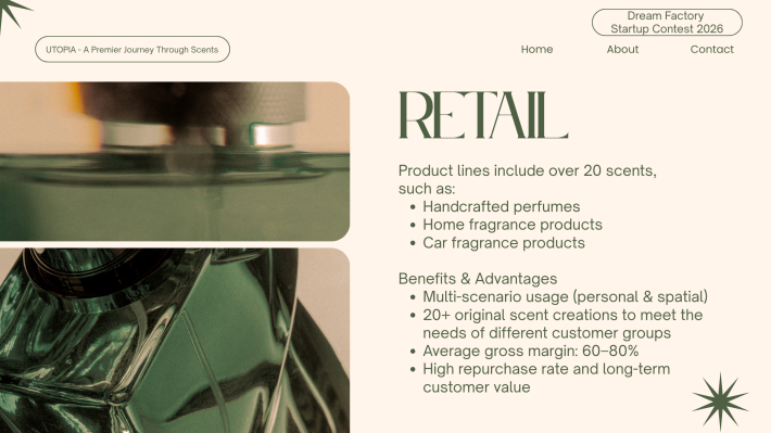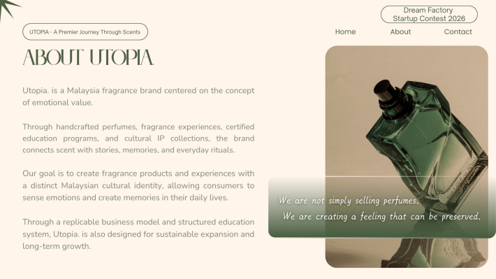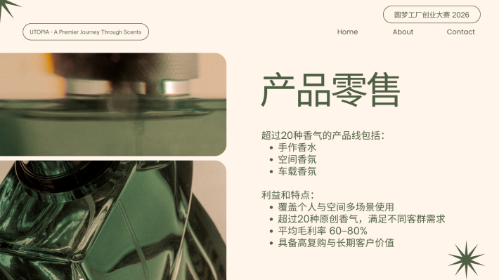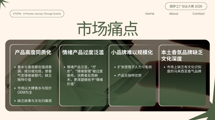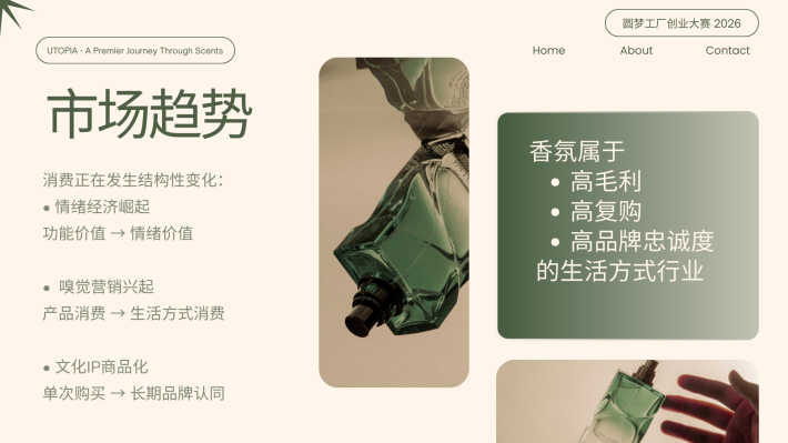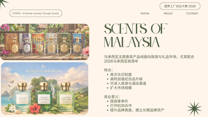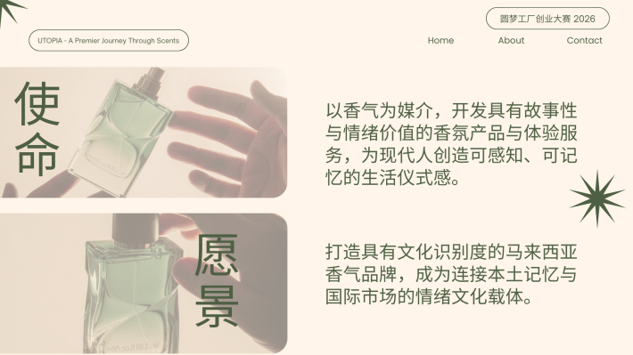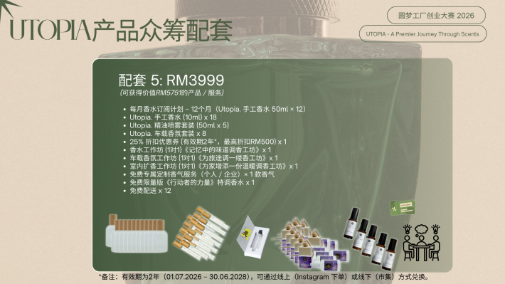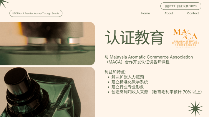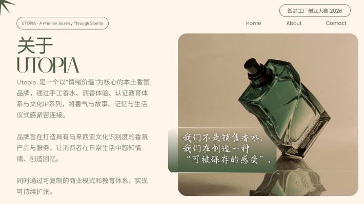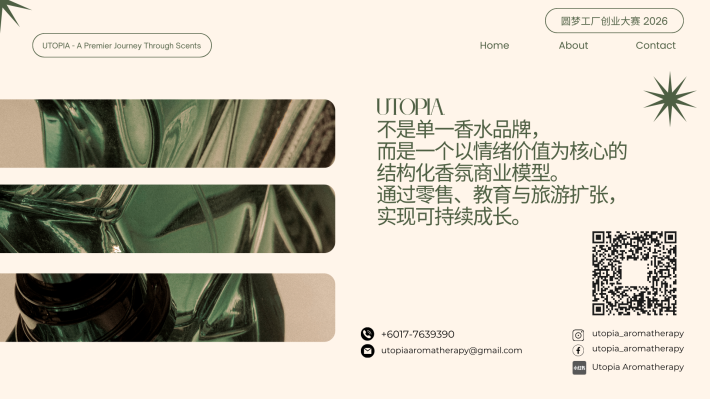 CS Pua Utopia. 创办人|调香师 对香气有近乎本能的热爱,也偏爱宁静与深度思考的空间。我相信,香气不仅是嗅觉体验,更是一种能够承载记忆与情绪价值的媒介。 2024年,选择裸辞创业,正式投身香氛行业。从零开始构建品牌体系。目标并非只打造一个香水品牌,而是建立一个以“情绪价值”为核心的结构化香氛商业模型,通过产品零售、体验式教育与文化旅游延展,形成可持续成长的香气生态。 香气不是奢侈品,而是一种可被设计、被保存、被传递的生活仪式。